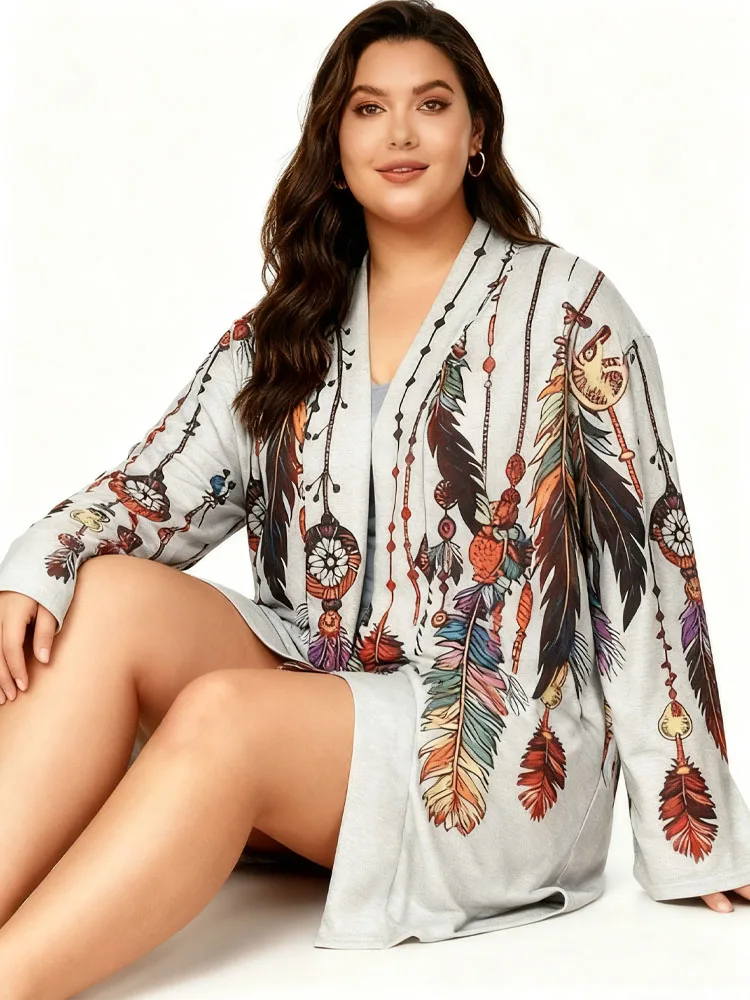 Clearance Plus Size Ethnic Print Long Sleeve Top Coat Bohe Retro Mid-Length Cardigan Daily Comfortable Female Clothing On Sale